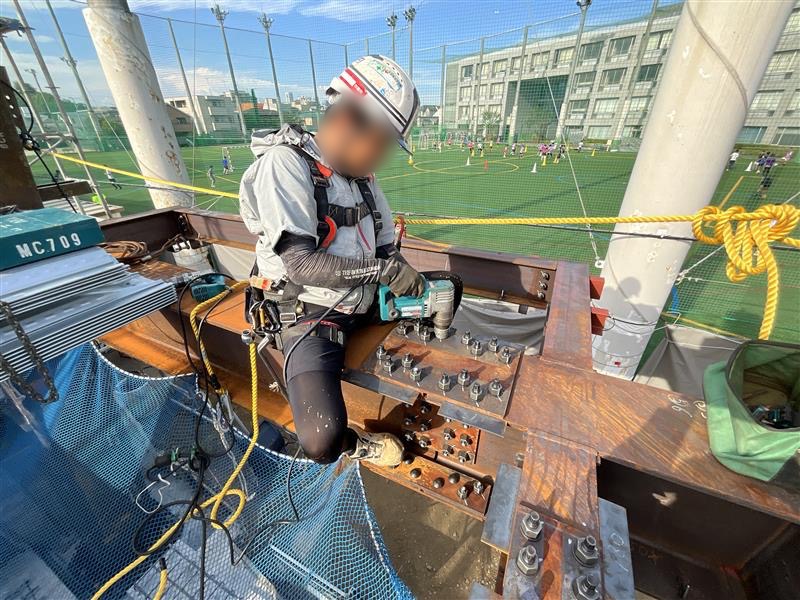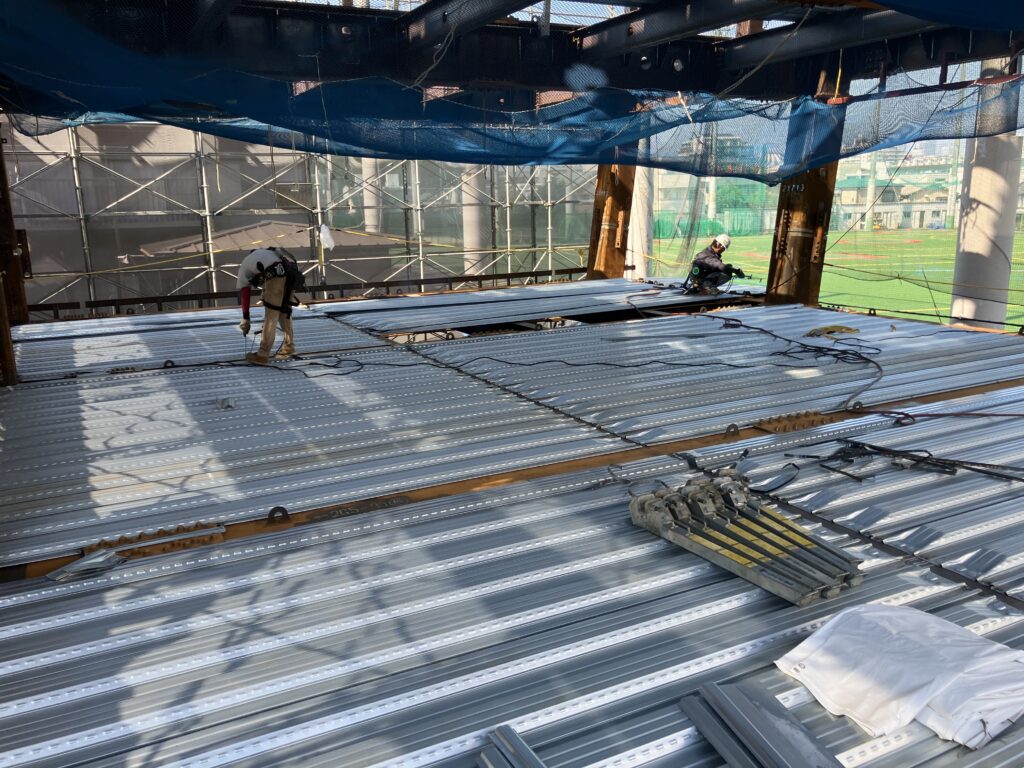 組み上げ作業が終わりますと、床の下地となる鉄板を梁と溶接して各階に敷き詰めていきます。