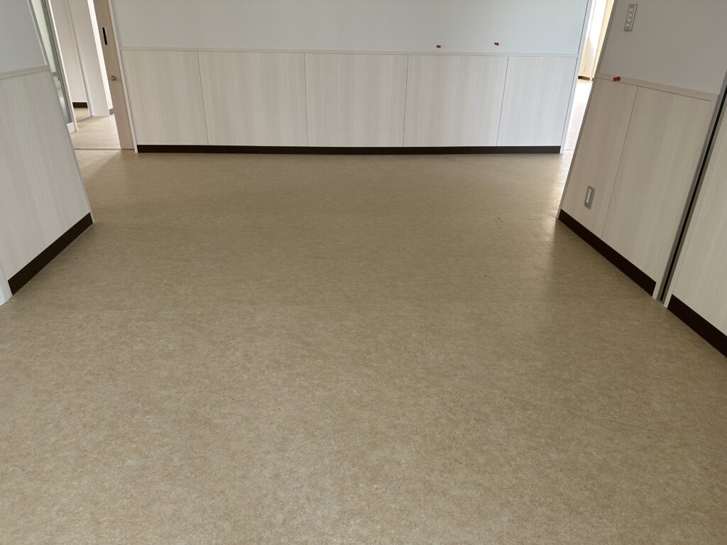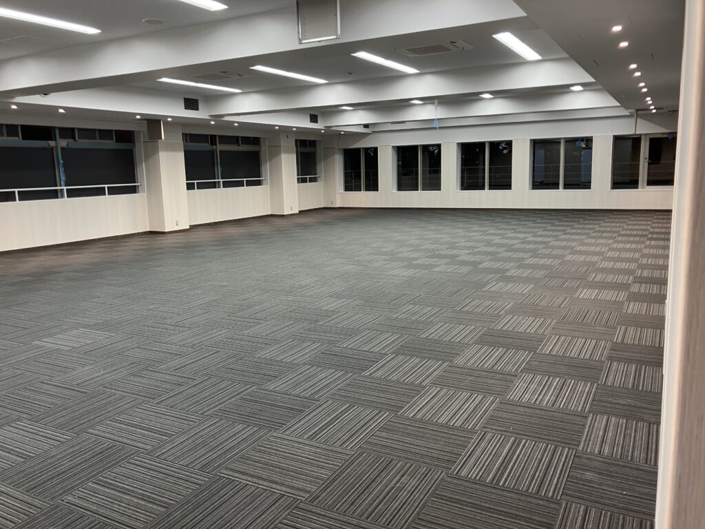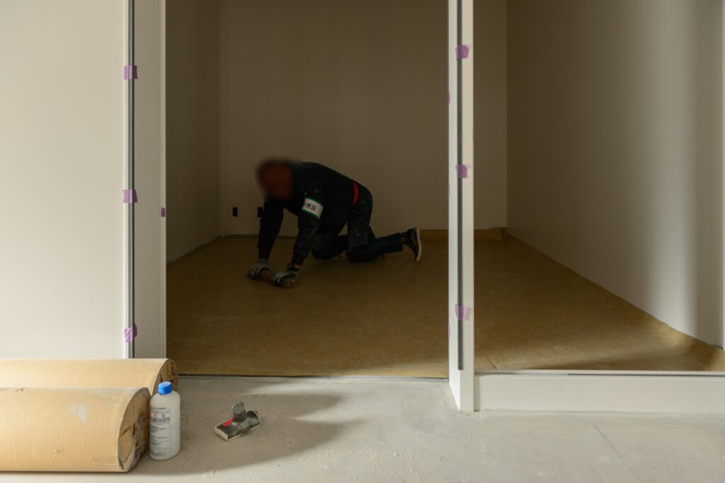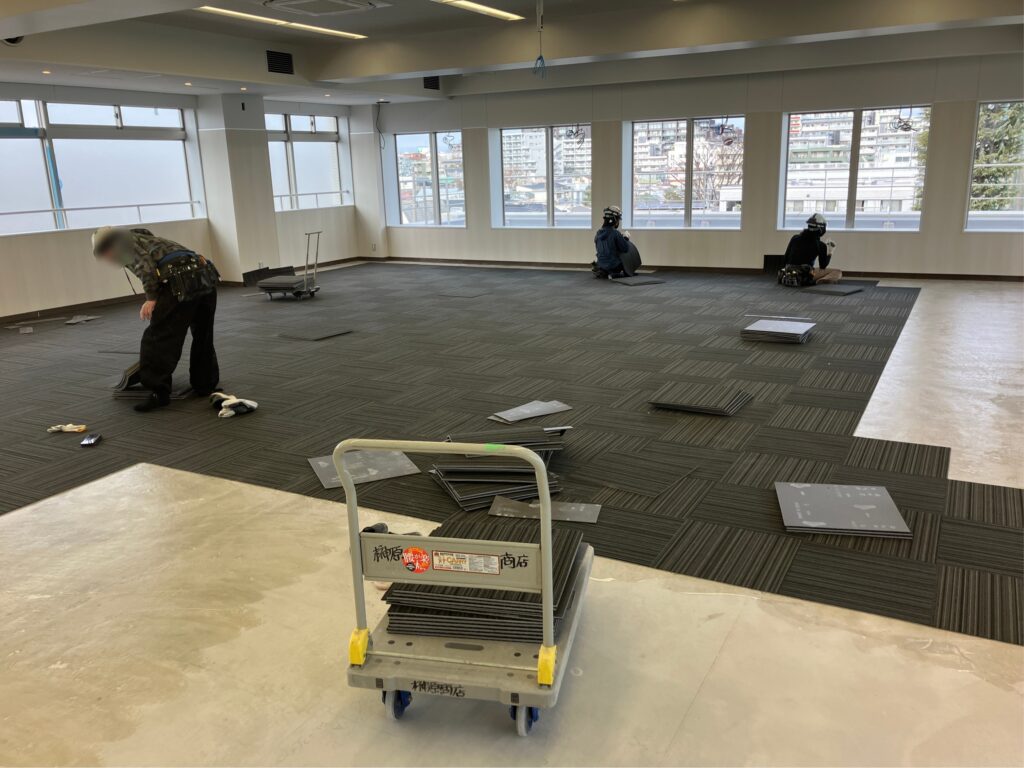前回の「建設レポート⑪」でご報告させていただいた、内壁と天井の設置作業が完了し、床材となる塩化ビニルシートやタイルカーペットが敷設されました。