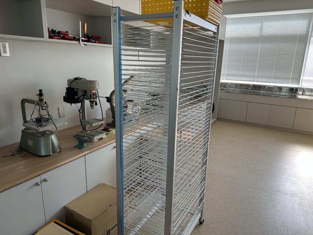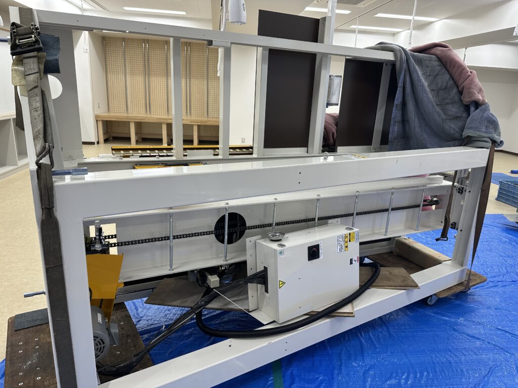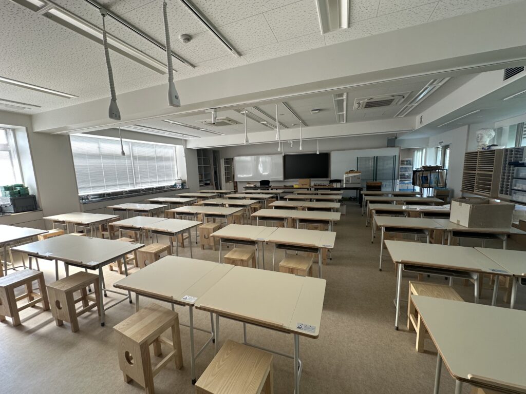 2階アトリエ(美術室)では、机や椅子、乾燥棚、電動糸のこぎり機が搬入されました。