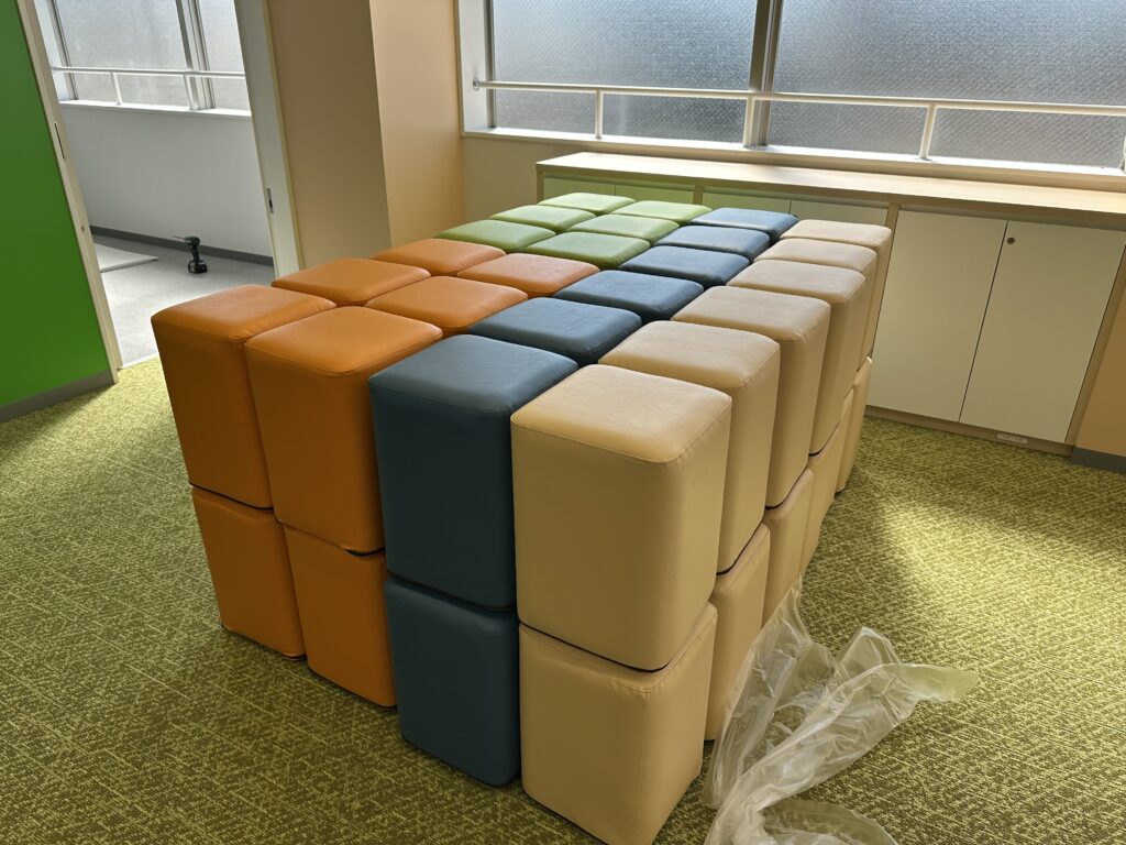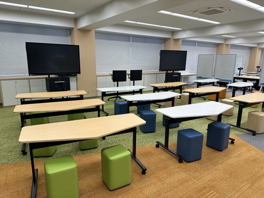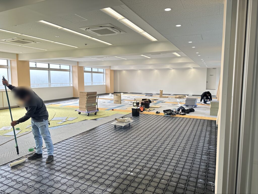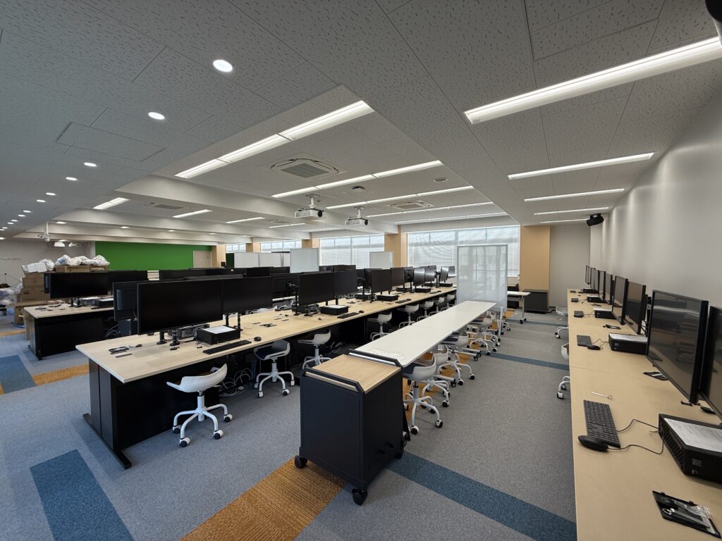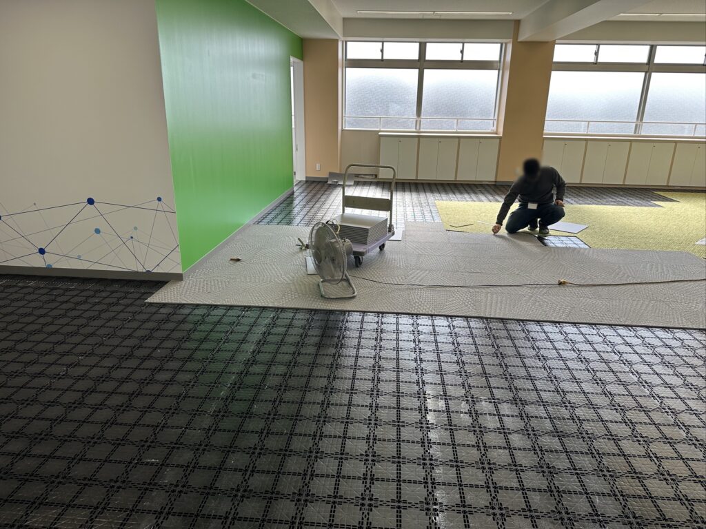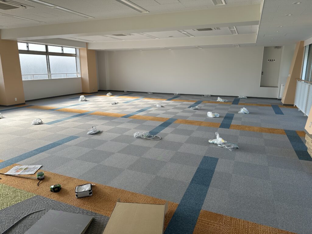 3階のICTラボについては、最先端のデジタル環境を構築するため、デザインから機器什器の選定、最終的な内装工事まで全ての工程を専門の業者が担当いたしました。まずフロア全面にタイルカーペットが敷設されました。