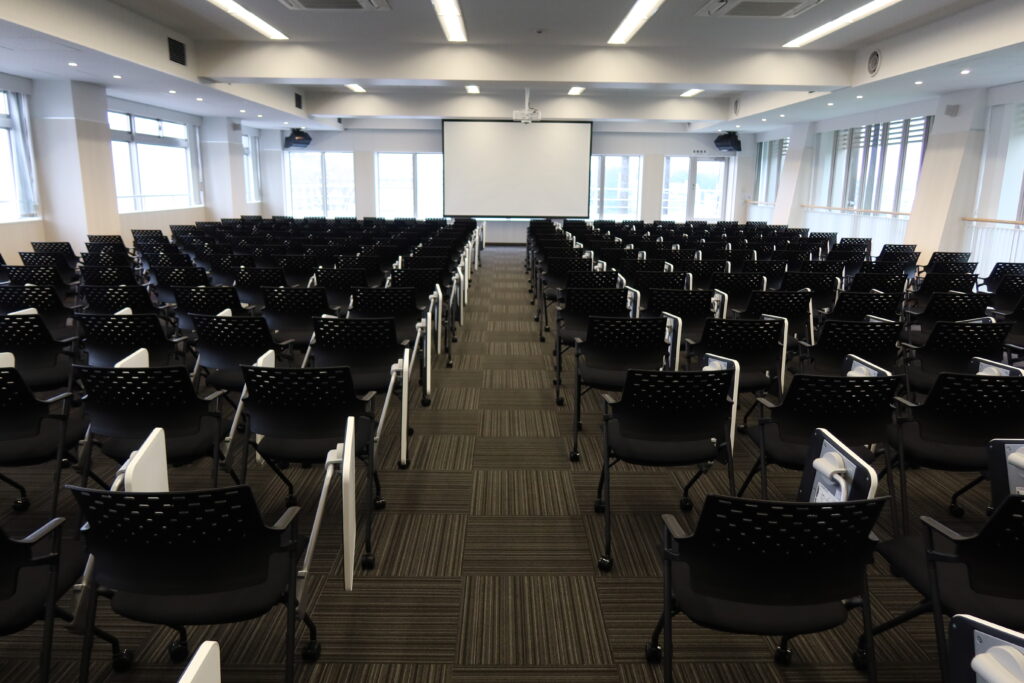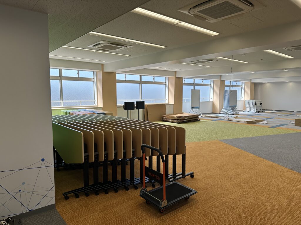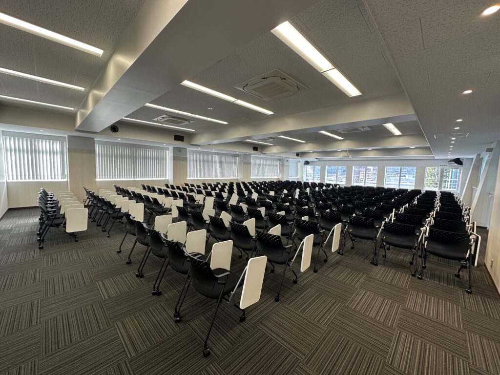 4階白雲館ホールでは、270脚もの折りたたみ椅子の搬入が行われました。こちらには、建築工程の段階でプロジェクターが備え付けられております。