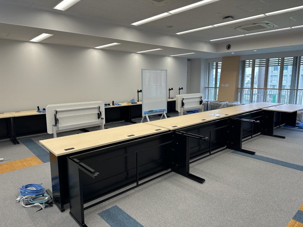 前回の「建設レポート⑫」でご報告させていただいた通り、すべての建築工程が完了した「白雲館」では、各教室へ機器什器の設置作業が進められました。