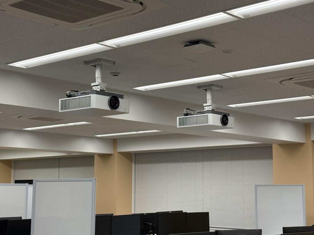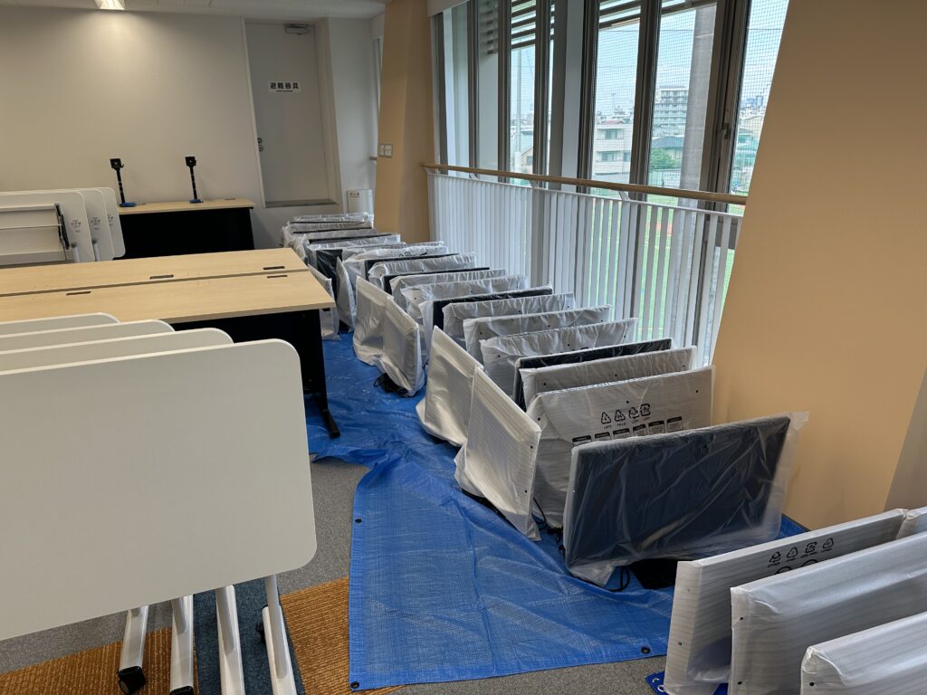 続いて、ICTラボ奥側のPCスペースへの機器什器の搬入および配置、プロジェクターの設置が行われました。